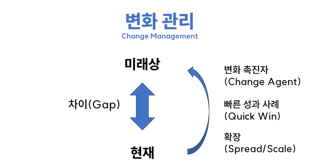 변화 관리는 경영학에서 나온 조직의 성장 방법론으로, 다음 5단계로 구성된다: