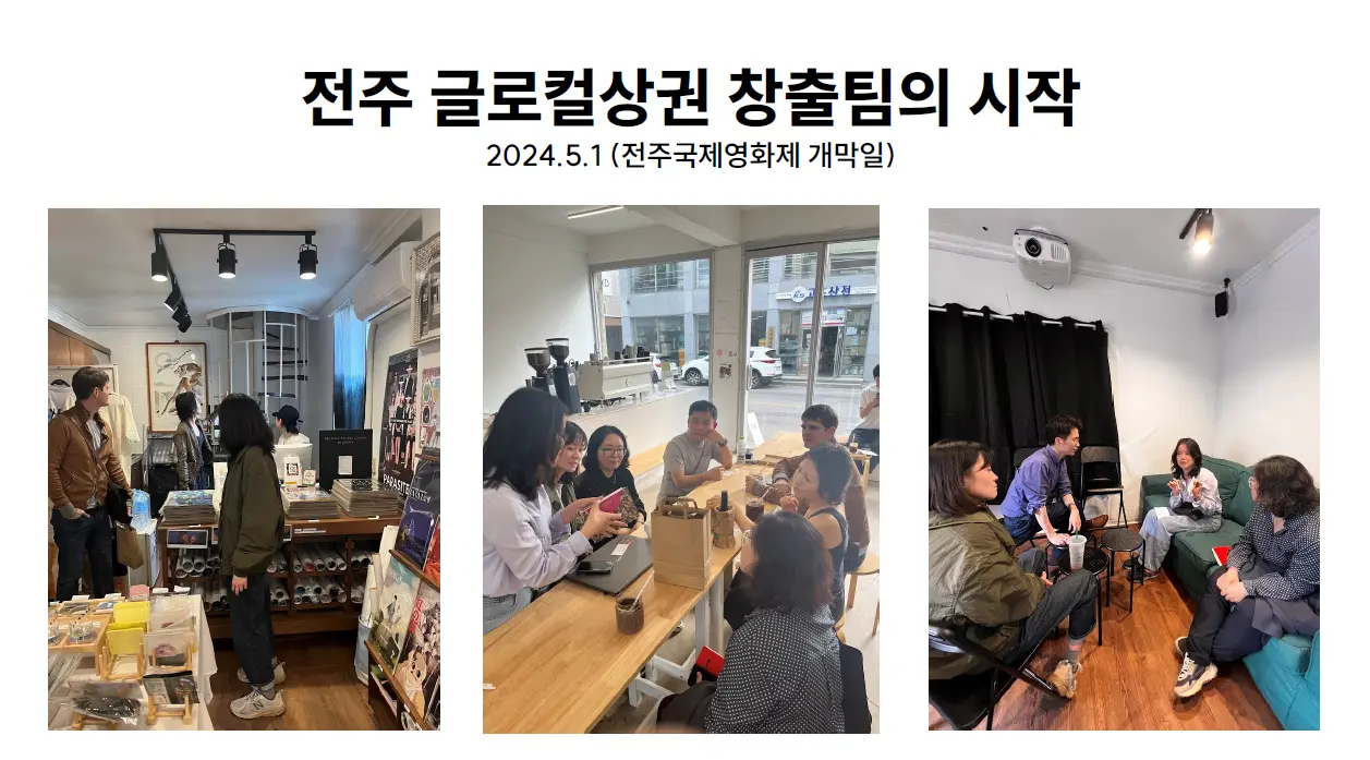 그러다가 2024년에 중기부 글로컬상권창출 사업 참여를 계기로 본격적인 변화 관리가 시작되었다. 5월 1일 전주국제영화제 개막일, 무명씨네협동조합에서 그동안 만났던 사람들을 모아 전주 글로컬상권창출팀이 탄생했다.
